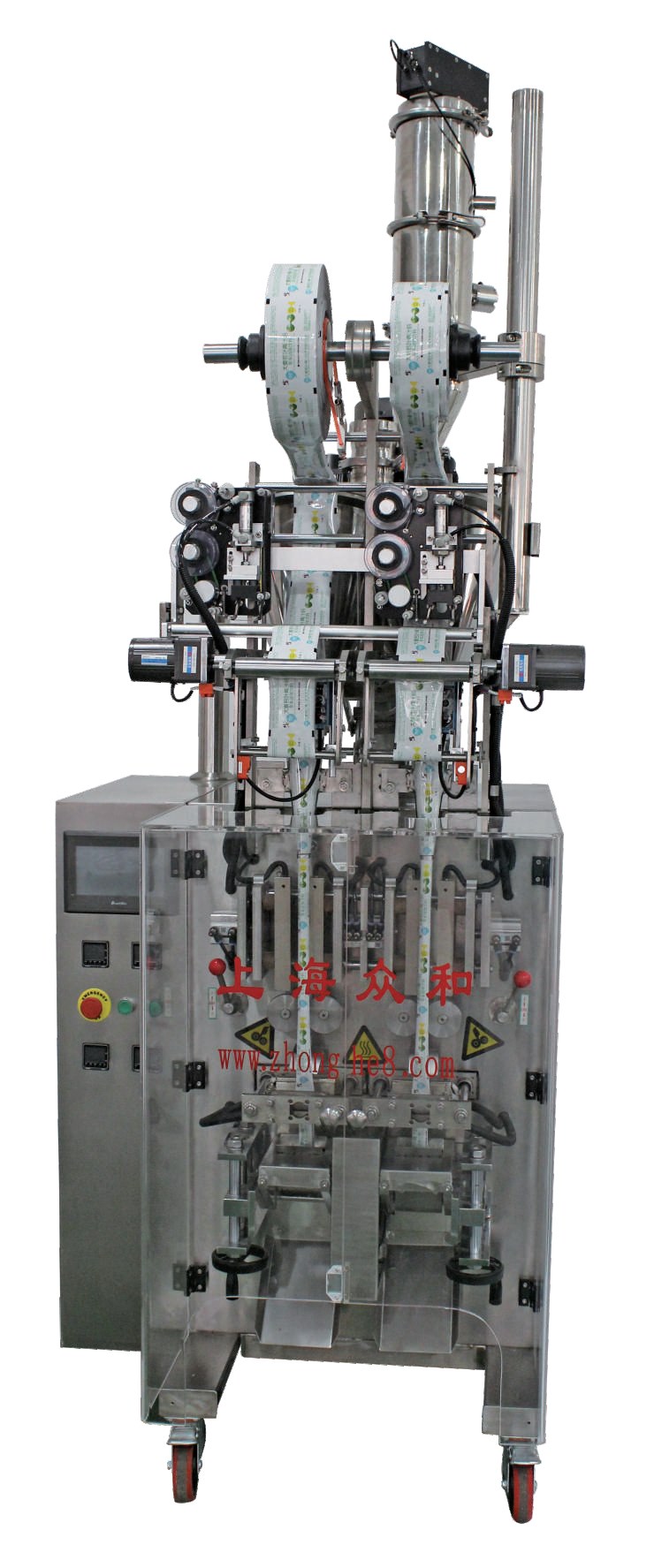 包裝原理:每列單獨卷膜;一個計量裝置分2個計量下料包裝:可以單獨開任意一列,也可以雙列一起工作